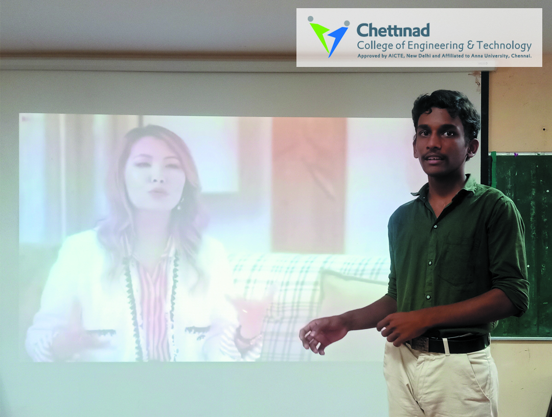 A special orientation training programme "WHERE I AM GOING" was conducted for the First year B.E students by Mr.Antony Prakash, Senior Human Resource Manager, Chettinad Learning and Development (CLEAD)The programme was an eye-opener for the first year students on social skills, professional skills, life skills, communication skills and employability skills. The icebreaking activities made the students to feel at ease and made them understand and identify their innate skills they possess.Each activity was student-centric, professional and lively. This programme gave an opportunity for the students to gain overall view of engineering and academic studies. The tips given to improve communication skills were quite useful and practical.The cordial approach of the trainer made the students to participate enthusiastically with full vigor and the budding engineers have gained ample knowledge in their field. The orientation programme was useful and it helps the students to get streamlined and steered with positive energy.