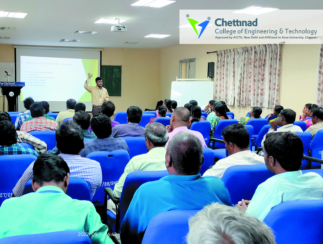 Mr. D. Karthikeyan, First Year MBA welcomed the gathering.Ms. D. S. Vidya, First Year MBA introduced the Chief Guest to the gathering.1-day hands-on training programme on Digital Marketing was organized for the I MBA students to introduce them to the current industrial trends and scope in digital media. Mr. Pritish Debsharma, General Manager - IT, Chettinad Niyogaa moderated the session with the importance of digital marketing, digital marketing fundamentals, Facebook, website creation, search engine optimization, social media marketing, email marketing and analytics.Dr.(Mrs). A. Punitha, Principal & Mr. M. Sathishkumar, Admin of Chettinad College of Engineering and Technology, Karur felicitated over the function.Ms. U. Mithra, First Year MBA delivered the vote of thanks.